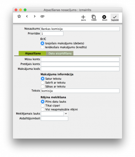 Share on ... Google+ Twitter LinkedIn Facebook Pinterest Telegram Kā izveidot atpazīšanas nosacījumu bankas komisijai? Modulis: Bankas savienojums Iestatījumi: Atpazīšanas nosacījumi Lai izveidotu Atpazīšanas nosacījumu bankas komisijas atpazīšanai un grāmatošanai, izveido jaunu atpazīšanas ierakstu, kurā norādi: Atpazīšana Nosaukums - atpazīšanas kritērija nosaukums Prioritāte - skaitlis “1”, vai cita vērtība, kas mazāka kā Galvenajos Bankas iestatījumos norādītā “Grāmatot līdz prioritātei, ieskatot” vērtību, ja vēlies lai Bankas komisija pēc tās atpazīšanas tiktu grāmatota. D/C - Izejošs maksājums (debets) Maksājuma informācija - atzīme “Satur tekstu” Teksts - komisija Datu aizpildīšana Grāmatojuma konts - ievieto bankas komisijas izmaksu kontu Ievietojamais komentārs - ievieto tekstu, ko vēlas redzēt kā komentāru Ierakstā, kas tiks izveidots Ja vēlies, lai Ierakstā, kas tiks izveidots tiktu izmantots komentārs, kas norādīts bankas izdrukā atzīmē Komentārā ielikt maksājuma info. Piemēram bankas izdrukā minēts “Internetbankas apkalpošanas komisija”, bet vēlies lai Moneo izveidotajā grāmatojumā Komentārā būtu minēts “Bankas komisija”, laukā Ievietojamais komentārs norādi “Bankas komisija”, bet, ja vēlies lai grāmatojumā Komentārā būtu minēts tieši tas pats, kas bankas maksājuma informācijā, lauku atstāj tukšu un atzīmē Komentārā ielikt maksājuma info. Veidot/atrast ierakstu - atzīmē Grāmatojums Last modified: 7 years ago