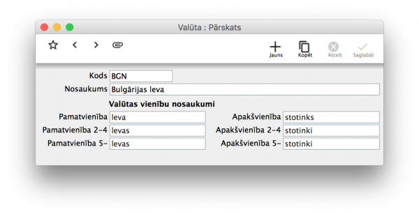 Share on ... Google+ Twitter LinkedIn Facebook Pinterest Telegram Kā izveidot jaunu valūtu? Modulis: Finanses Tabula: Valūtas Lai pievienotu jaunu valūtu un nodrošinātu šādas valūtas automātisku importu laukā: Kods - norādi valūtas kodu pēc starptautiskā valūtu klasifikatora Nosaukums - norādi valūtas nosaukumu Valūtas vienību nosaukumi - norādi valūtas vienības un apakšvienības daudzskaitļos Last modified: 7 years ago