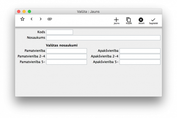 Laukā Pamatvienība norāda valūtas pamatvienību vienskaitļa nominatīvā