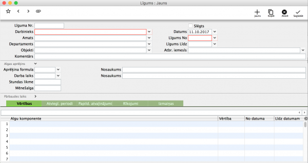 Share on ... Google+ Twitter LinkedIn Facebook Pinterest Telegram Table of Contents Darba Līgums Algas aprēķins Pārbaudes laiks Citas norādāmās vērtības Biežāk uzdotie jautājumi Darba Līgums Lai aprēķinātu darbinieka algu, nepieciešams izveidot Darba līgumu. Laukā Darbinieks norāda darbinieka vārdu un uzvārdu vai to izvēlās no apakšizvēlnes. Piešķir darbiniekam Amatu, kas atbilst Profesijas klasifikatora NACE.2 redakcijai. Laukā Datums norādāms datums, kad sastādīts Darba līgums, bet laukā Līgums no norāda līguma stāšanās spēkā datumu. Ja darbinieku algu izmaksas nepieciešams grāmatot uz dažādiem izmaksu kontiem, Darba līgumā jānorāda Departaments, ko, definējot algu aprēķinu, norāda algu komponentē sadaļā Kontējums. Departaments dod iespēju ģenerējot atskaites sašaurināt attēlojamo datu daudzumu vai analizēt konkrēta departamenta datus. Algas aprēķins Sadaļā Algas aprēķins norāda darbiniekam atbilstošo Aprēķinu formulu, kas satur algu, nodokļu, to piemērošanas nosacījumu, un atvieglojumu komponentes, kas veic aprēķinu funkciju. Lai nodrošinātu ērtāku darba laika tabeļu aizpildīšanu un nodrošinātu nostrādāto, nenostrādāto, attaisnotas prombūtnes un citu stundu uzglabāšanu sistēmā vēlākiem aprēķiniem, Darba līgumā norāda darbiniekam atbilstošo Darba laiku un attalgojumu - Stundas likmi vai Mēneša algu Pārbaudes laiks Darbiniekam piemērojot pārbaudes laiku, jāveic atzīme par tā esamību. Pēc atzīmes veikšanas sistēma pieprasa norādīt Pārbaudes laika sākumu un beigas, un norādīt Pārbaudes laikā piemērojamo mēnešalgu vai stundas tarifa likmi, kas tiks izmantota veidojot Algu aprēķinus norādītajā Pārbaudes laika periodā Citas norādāmās vērtības Biežāk uzdotie jautājumi Kā izveidot jaunu darbinieku? Last modified: 8 years ago