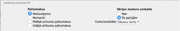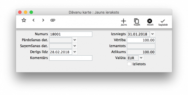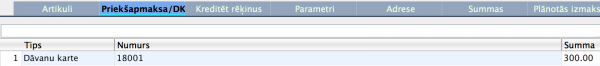 Share on ... Google+ Twitter LinkedIn Facebook Pinterest Telegram Table of Contents Dāvanu kartes Dāvanu kartes emitēšana Dāvanu kartes pārdošana Dāvanu kartes atprečošana Dāvanu kartes Dāvanu kartes ieraksti paredzēti dāvanu karšu uzskaitei uzņēmumā, to izlietojuma kontrole un izlietoto dāvanu karšu konstatēšanai. Numurs Apakšizvēlne: Dāvanu kartes Numurs no iestatījuma Numuru sērijas Pēc noklusējuma: Nākošais brīvais numurs pieejamā sērijā Unikāls Dāvanu karti identificējošs numurs. Pārdošanas datums Pēc noklusējuma: Datums, kad dāvanu karte pārdota Sistēma, pēc dāvanu kartes pārdošanas, ierakstā ievieto pārdošanas datumu Saņemšanas datums Pēc noklusējuma: Datums, kad dāvanu karte atprečota Sistēma pēc dāvanu kartes atprečošanas ierakstā ievieto atprečošanas datumu Derīgs līdz Apakšizvēlne: Ievietot datumu Pēc noklusējuma: Pārdošanas datumam pieskaitīti derīguma mēneši no Realizācijas parametriem Sistēma pēc Derīguma termiņa datuma aizliedz šādu dāvanu karti izmantot atprečošanas nolūkam. Komentārs Pēc noklusējuma: Pēc pārdošanas tiks ievietots teksts “Dāvanu karte” Izsniegts Pēc noklusējuma: Pēc pārdošanas tiks ievietots pārdošanas datums Vērtība Brīva teksta lauks: Dāvanu kartes vērtība Pēc noklusējuma: Ievietojās Dāvanu kartes vērtība pēc pārdošanas Ja Dāvanu kartes vērtība norādīta Dāvanu kartes ierakstā, bet pārdodot Dāvanu karti tiks norādīta cita vērtība, ievadītā vērtība aizvietos jau ievadīto vērtību Izmantots Pēc noklusējuma: Dāvanu kartes izmantotā vērtība Pēc Dāvanu kartes izmantošanas, rēķinu sedzot ar dāvanu karti, Dāvanu kartes ierakstā ievietosies konkrētās Dāvanu kartes kopējā izmantotā summa Atlikums Pēc noklusējuma: Dāvanu kartes atlikusī vērtība Pēc Dāvanu kartes izmantošanas, rēķinu sedzot ar dāvanu karti, Dāvanu kartes ierakstā ievietosies konkrētās Dāvanu kartes atlikusī neizmantotā summa Valūta Pēc noklusējuma: Bāzes valūta Izlietots Pēc noklusējuma: Atzīmes rūtiņa aizpildās mirklī, kad Dāvanu kartes kopējā summa ir izmantota vai dāvanu kartei ir beidzies termiņš Atzīmi par to, ka Dāvanu karte ir Izlietota, var ievietot arī manuāli. Pēc šādas atzīmes veikšanas, Dāvanu karti nebūs iespējams izmantot atprečošanai Dāvanu kartes emitēšana Sistēmā ir iespējams emitēt (reģistrēt) Dāvanu kartes, kādas uzņēmums ir paredzējis pārdošanā. Dāvanu karšu emitēšana (reģistrēšana) nenozīmē tās pārdošanas procesu. Ja uzņēmumam ir Dāvanu kartes nodrukātā veidā ar numuriem, tās iespējams sistēmā piereģistrēt ar šādiem pašiem numuriem vēlākai to pārdošanai. Ja tiek emitētas (reģistrētas) dāvanu kartes, tās jāreģistrē norādot šādus laukus: Numurs Derīgs līdz- ja Dāvanu kartei ir noteikts derīguma termiņš, bet nav norādīts derīguma termiņš Realizācijas parametros Dāvanu kartes pārdošana Lai pārdotu Dāvanu karti, nepieciešams izveidot vismaz vienu Artikulu “Dāvanu karte”, kura Noliktavas parametros, sadaļā Sērijas numuru uzskaites sadaļā norāda: Pa partijām Funkcionalitāte - Dāvanu karte Dāvanu kartes pārdošana Rēķinā Ja Dāvanu kartes ir emitētas (reģistrētas) pirms pārdošanas, Rēķinā norāda Dāvanu kartes artikulu. Norāda Cenu (dāvanu kartes vērtību) par kādu tā tiek pārdota un Daudzumu “1”. Kolonnā Partijas numurs norāda vai izvēlas no apakšistēmas iepriekš reģistrētās Dāvanu kartes numuru. Ja nepieciešams rēķinā pārdot vairākas Dāvanu kartes, katru Dāvanu karti ievada atsevišķā rindā. Pēc Rēķina grāmatošanas Dāvanu kartes ieraksts tiks koriģēts atbilstoši pārdošanas datiem. Dāvanu kartes atprečošana Lai atprečotu Dāvanu karti, jeb dzēstu Rēķina neapmaksāto daļu ar to, samazināmā Rēķina sadaļā Priekšapmaksa/DK kolonnā Tips norāda vai izvēlas vērtību Dāvanu karte kolonnā Numurs norāda vai izvēlas Dāvanu kartes Numuru kolonnā Summa tiks ievietota maksimālā iespējamā Dāvanu kartes summa, bet ne lielāka, kā rēķina neapmaksātā daļa. Summu ir iespējams koriģēt, ja paredzēts, ka Rēķina neapmaksātā daļa tiks apmaksāta ar citiem Darījumu veidiem caur Kasi vai Bankas pārskaitīju Last modified: 8 years ago