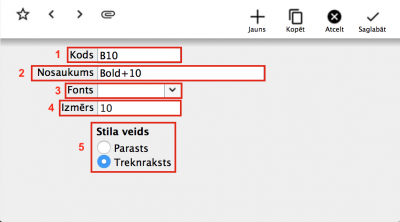 Share on ... Google+ Twitter LinkedIn Facebook Pinterest Telegram Stili Formatēšanas stili izmantojami Izdruku sagatavju un Finanšu atskaišu noformēšanai. Stils satur informāciju par to, kādā fontā, izmērā un formatējumā tiks formatēti attiecīgie dati. Nr. Lauka nosaukums Funkcija 1 Kods Piešķir Stilam secīgu vai lietotāja ievadītu kodu, vai kodu no Numuru sērijas iestatījuma 2 Nosaukums Stila nosaukums 3 Fonts Stila fonts no lietotāja datora. Ja netiek izmantots, tad tiek piemērots noklusējuma Fonts. Ja lietotājs izmanto citu, ne noklusējuma Fontu, tad šādam pašam fontam jābūt instalētam arī uz pārējo lietotāju datoriem. 4 Izmērs Fonta izmērs veselos skaitļos 5 Stila veids “Parasts” - Parasts fonts, “Treknraksts” - Treknraksta fonts Last modified: 8 years ago