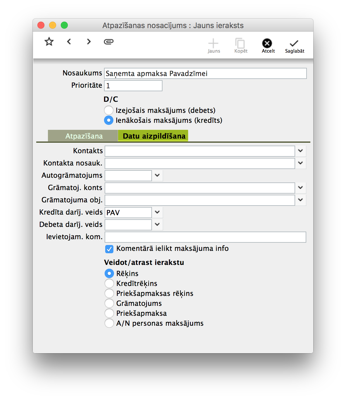 - Kā izveidot atpazīšanas nosacījumu saņemtai pavadzīmes apmaksai?