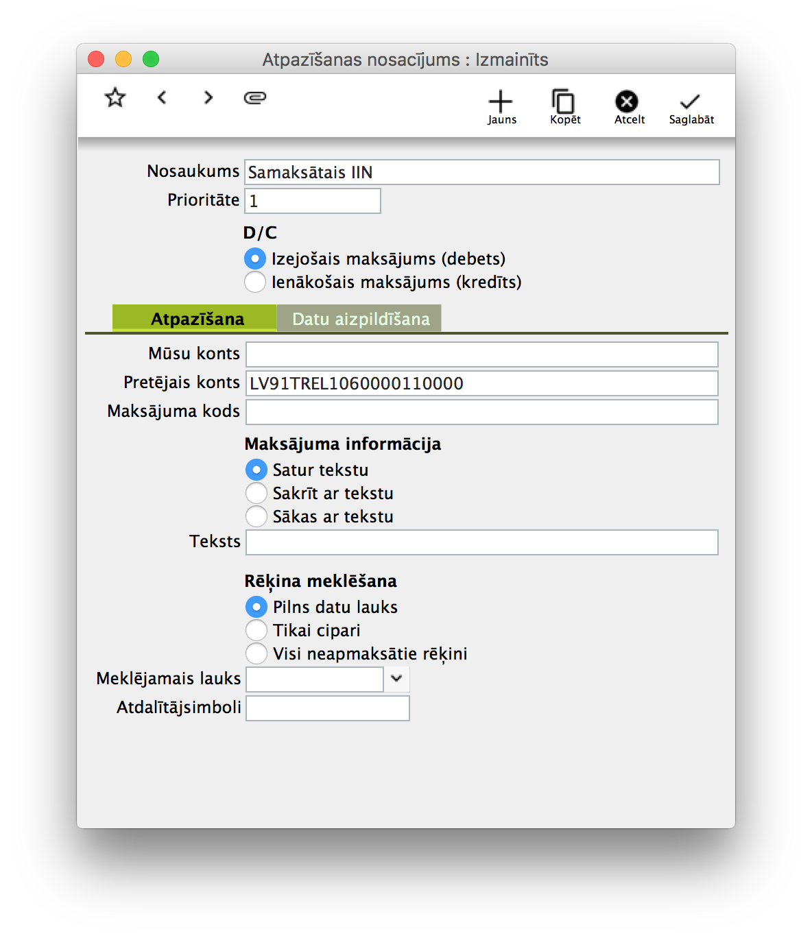 Kā izveidot atpazīšanas nosacījumu samaksātam IIN?