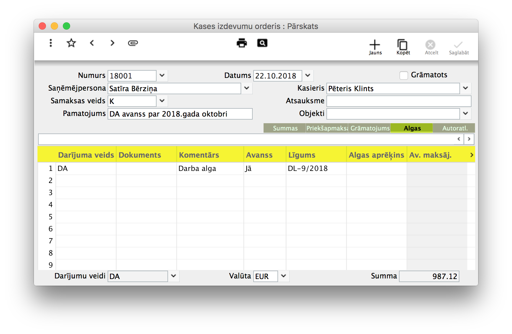Kā izmaksāt algas avansu ar Kases izdevumu orderi?